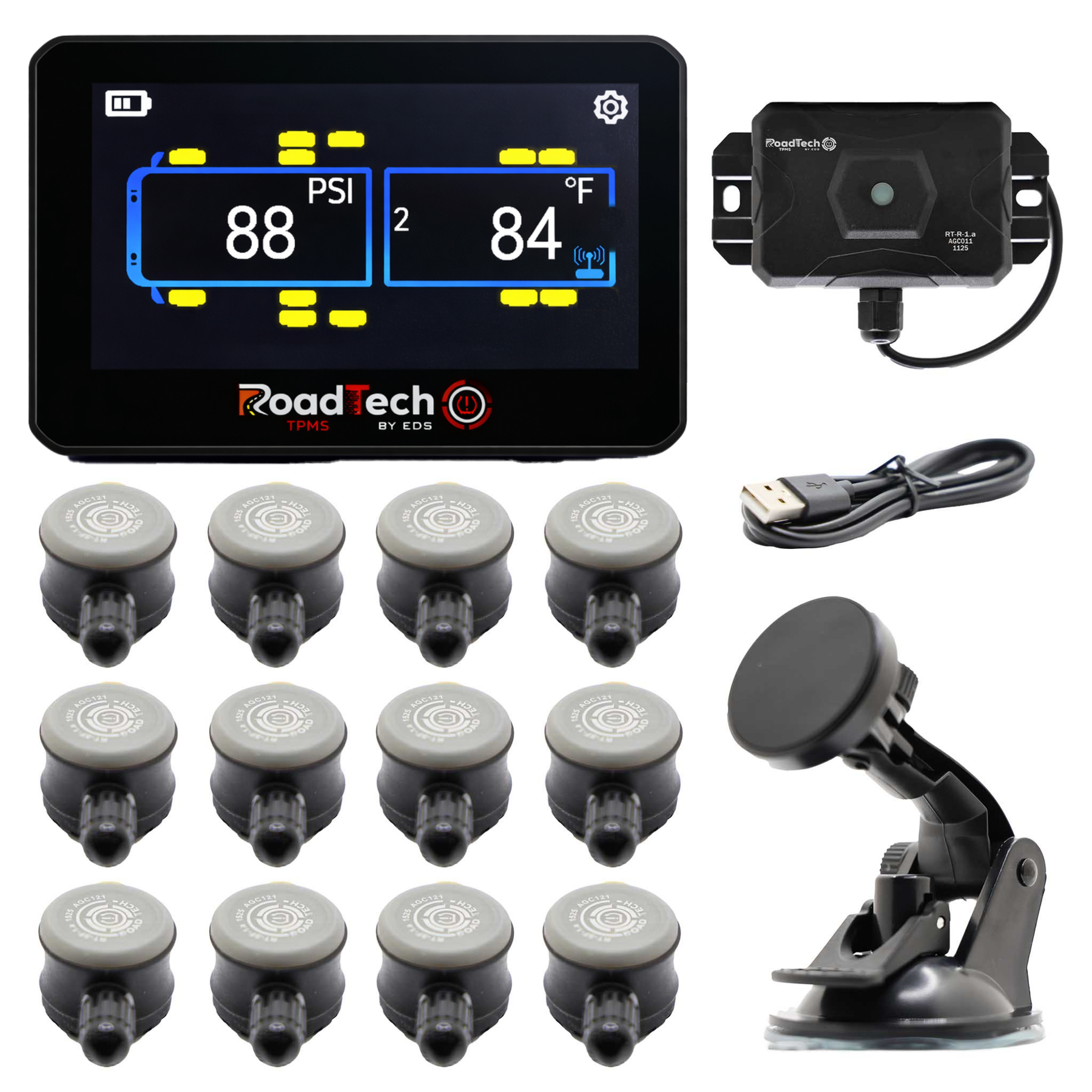 - Complete TPMS kit includes flow-through sensors, full-color HD monitor, signal repeater, power cable, mounting accessories, quick start guide, and RoadTech emblem decal - Inflate tires without removing sensors, thanks to flow-through valve design, thanks to flow-through valve design - Instantly receive alerts for over/under PSI, high temps, and leaks - Wireless pairing with RoadTech HD TPMS monitors - Anti-theft locking screws included for added sensor security - Retains memory and settings during battery changes - Designed for RVs, trailers, horse trailers, and motorhomes with metal stems - Ideal for boat haulers and truckers navigating long-distance routes - Easy installation in minutes with no special tools required - Trusted by long-haul RVers and tow vehicle owners for safety and convenience